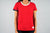 Women's red sporty t-shirt with colorful details on the sleeves and a small white pocket.